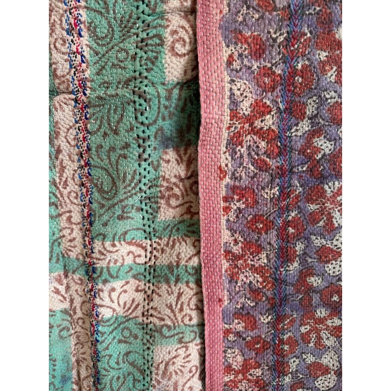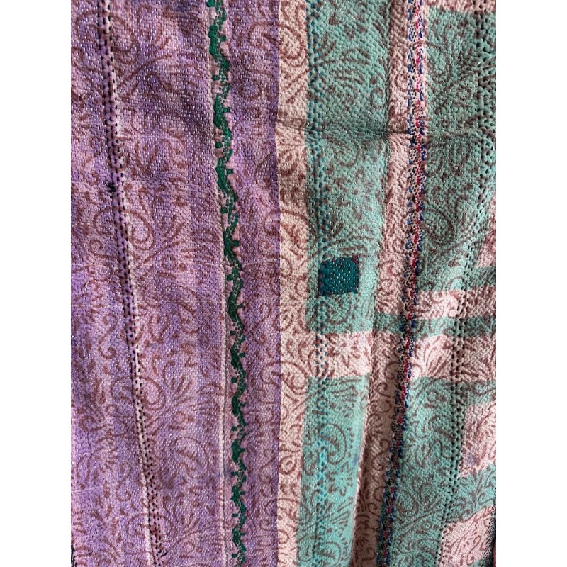 Couverture Kantha n° 10 Violet à fleurs et carreaux verts turquoise