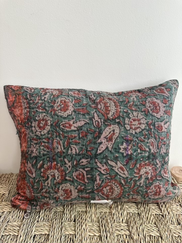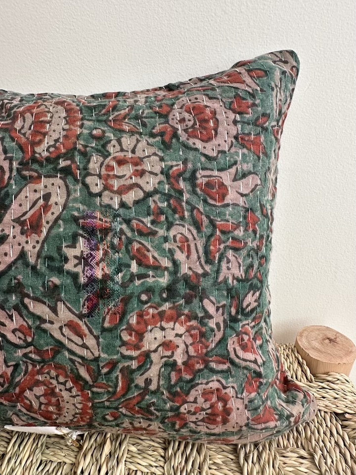 Coussins Kantha Vert Fleurs briques