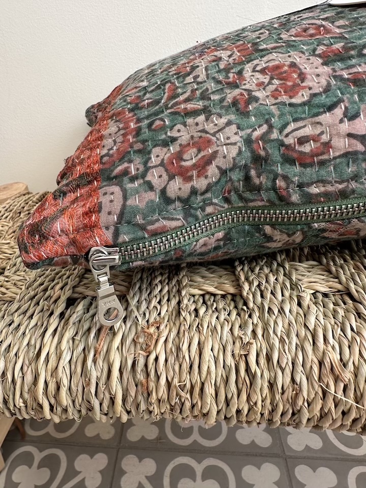 Cette technique ancestrale du "Kantha" permet de donner une seconde vie aux tissus en assemblant plusieurs couches de vêtements usés, en faisant de chaque couverture (recyclée ici en coussins) des pièces uniques, singulières et chamarrées.