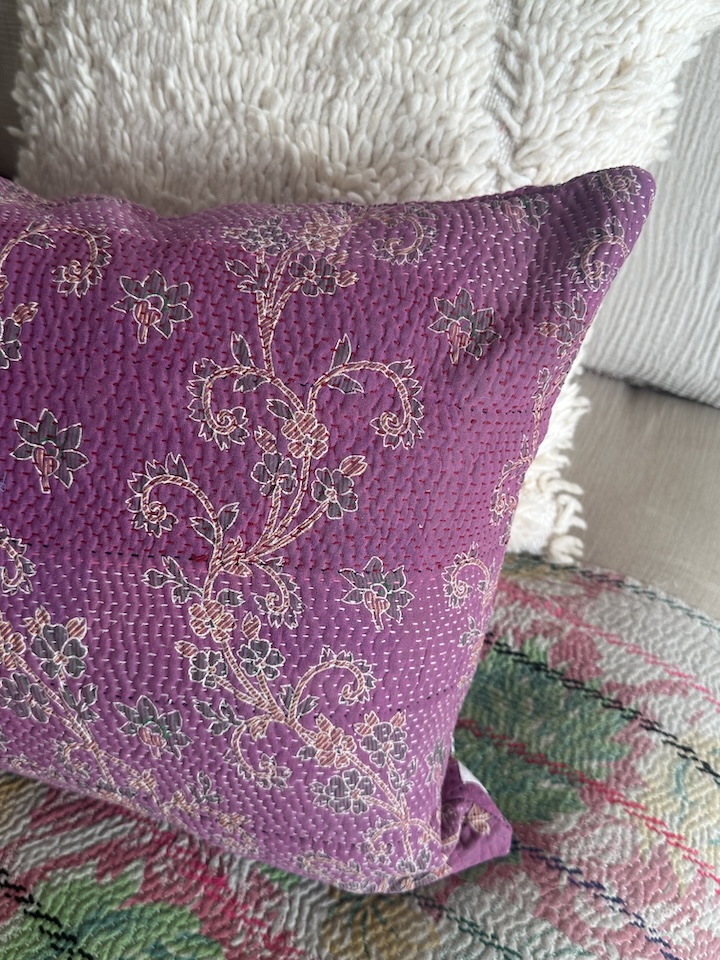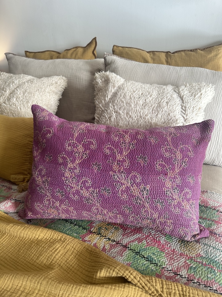 Plusieurs coussins en toute petite série sont taillés dans une même couverture en kantha. Chaque coussin est unique et peut présenter de légères différences de motifs par rapport aux photos sur le site.